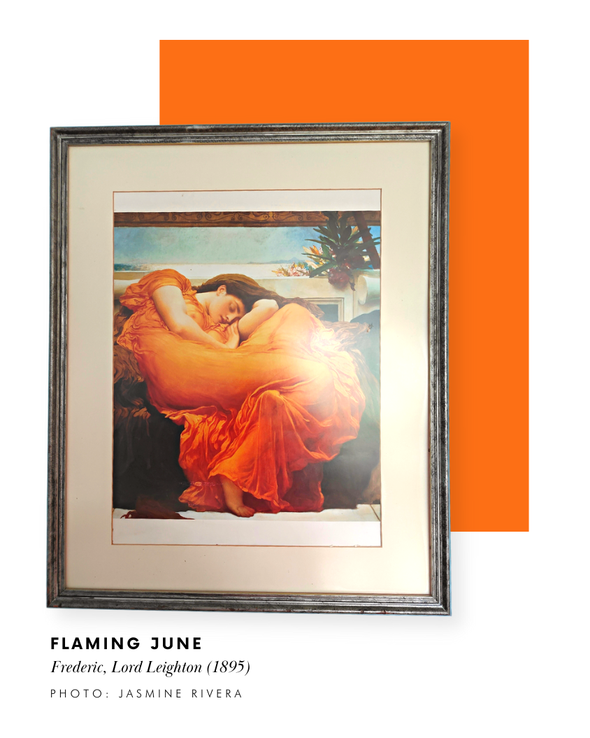 “A piece of art that I have carried with me from home to home since meeting her in college is The Flaming June. The first time I saw her I was struck by the gorgeous orange, how intense and vibrant the color is, and how the light and shadows of the fabric are exquisitely painted. All of this contrasted by how peaceful and serene she is, asleep in this somewhat vulnerable curled up position in what appears to be a warm or tropical land. She's been an inspiration for not only beauty but also rest in my life, which is why she can always be found in my bedroom.”